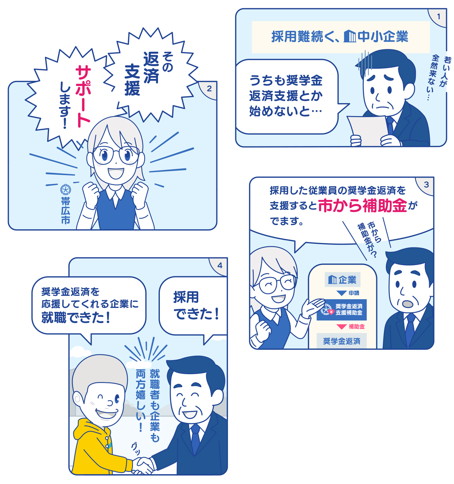 本特設サイトや帯広市ホームページにて、従業員の奨学金返済支援制度を持つ企業を掲載し、周知しています。