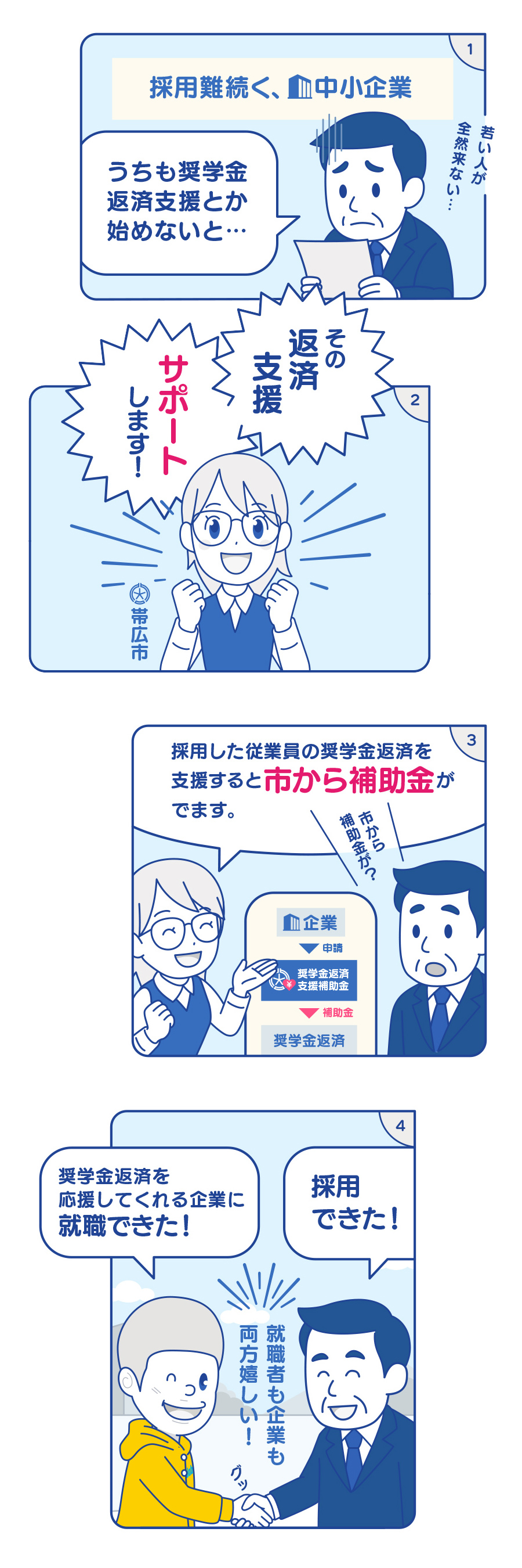 本特設サイトや帯広市ホームページにて、従業員の奨学金返済支援制度を持つ企業を掲載し、周知しています。
